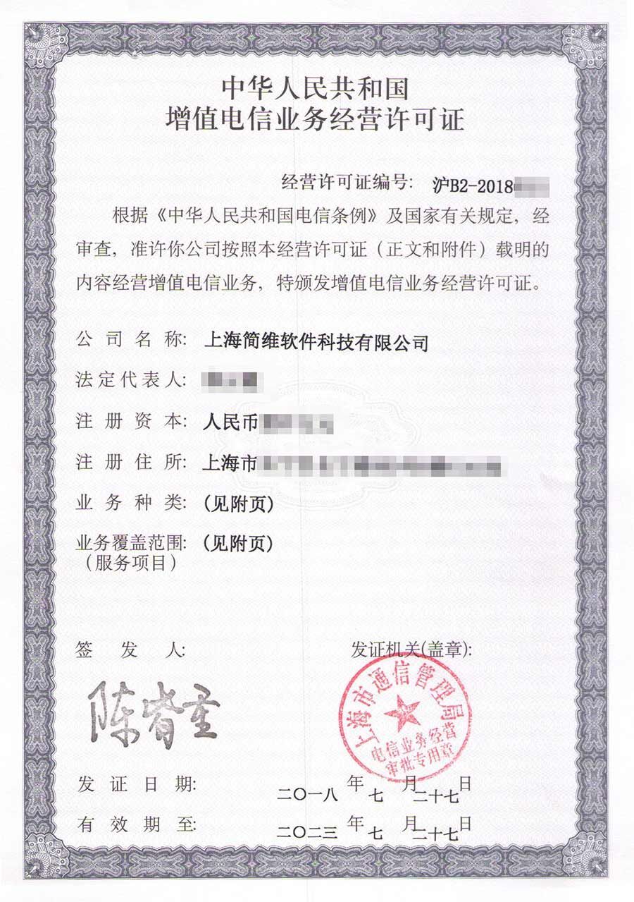 近日,上海簡維軟件科技有限公司正式取得由上海市通信管理局頒發的《中華人民共和國增值電信業務經營許可證》。